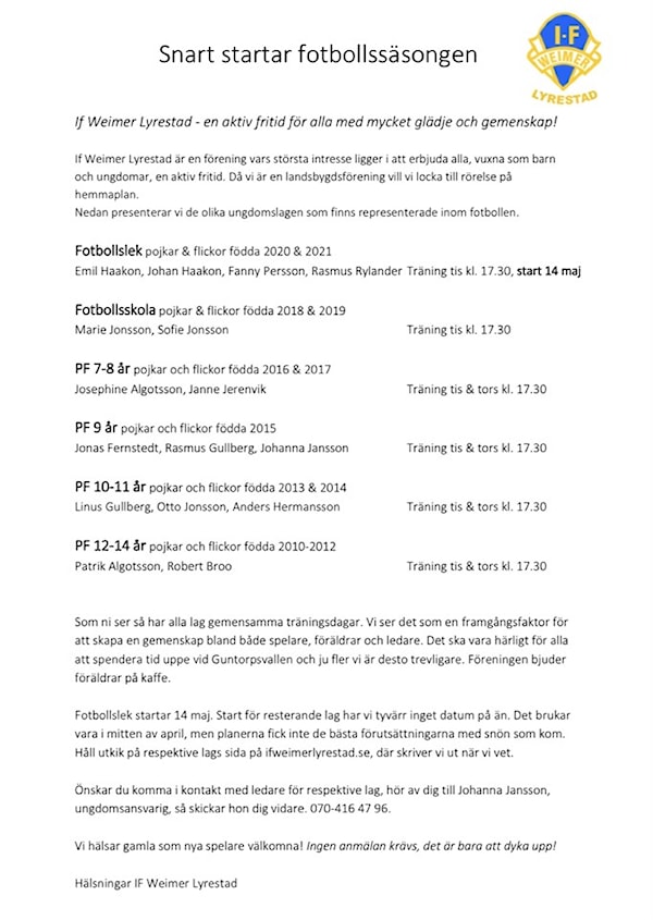 Så här ser föreningens lagstruktur och träningsdagar ut.